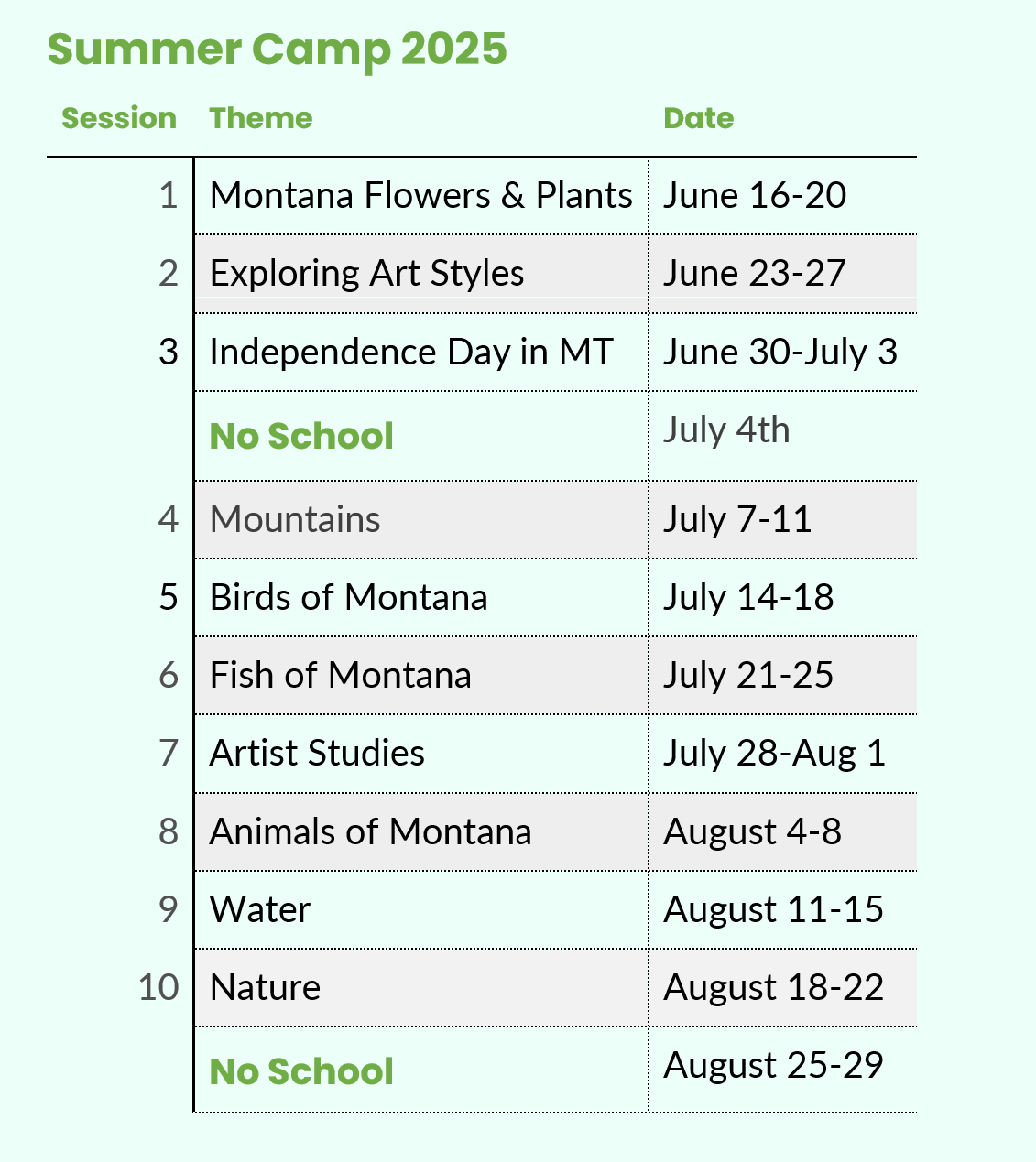 Summer days at Creative Arts are full of movement, imagination, and discovery. Campers start their day with playful connection and a themed circle time, followed by a nature walk or trail adventure where we observe plants, listen for birds, and explore the beauty of Montana’s summer season.